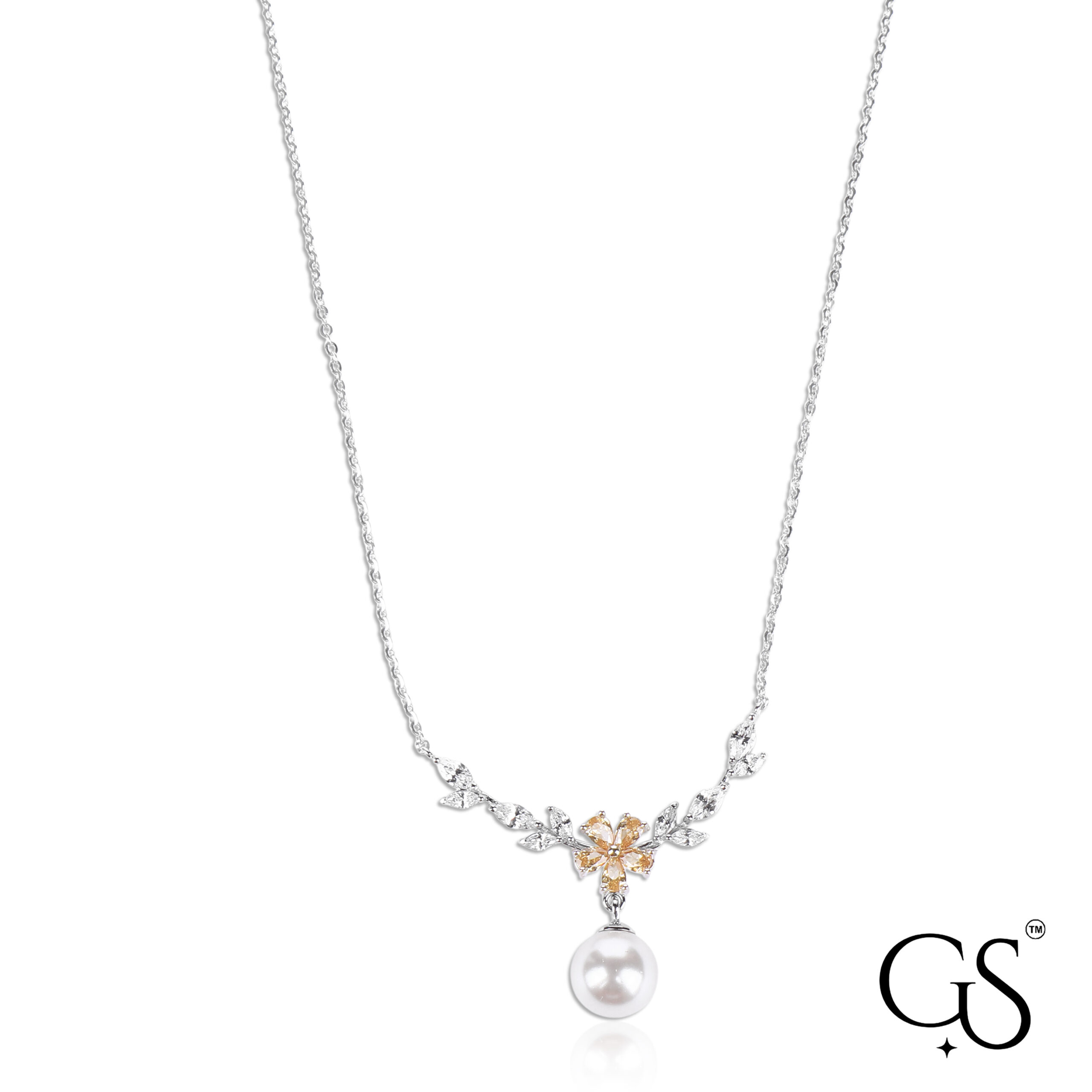 This enchanting Sterling Silver necklace captures the delicate beauty of a blooming vine. The centerpiece features sparkling marquise-cut clear stones forming graceful leaves, framing a central cluster of amber/yellowish-orange stones shaped like a flower. The entire floral arrangement culminates in a beautiful, luminous white drop pearl dangling below. This elegant and feminine piece is perfect for bridal wear, special occasions, or as a sophisticated gift.