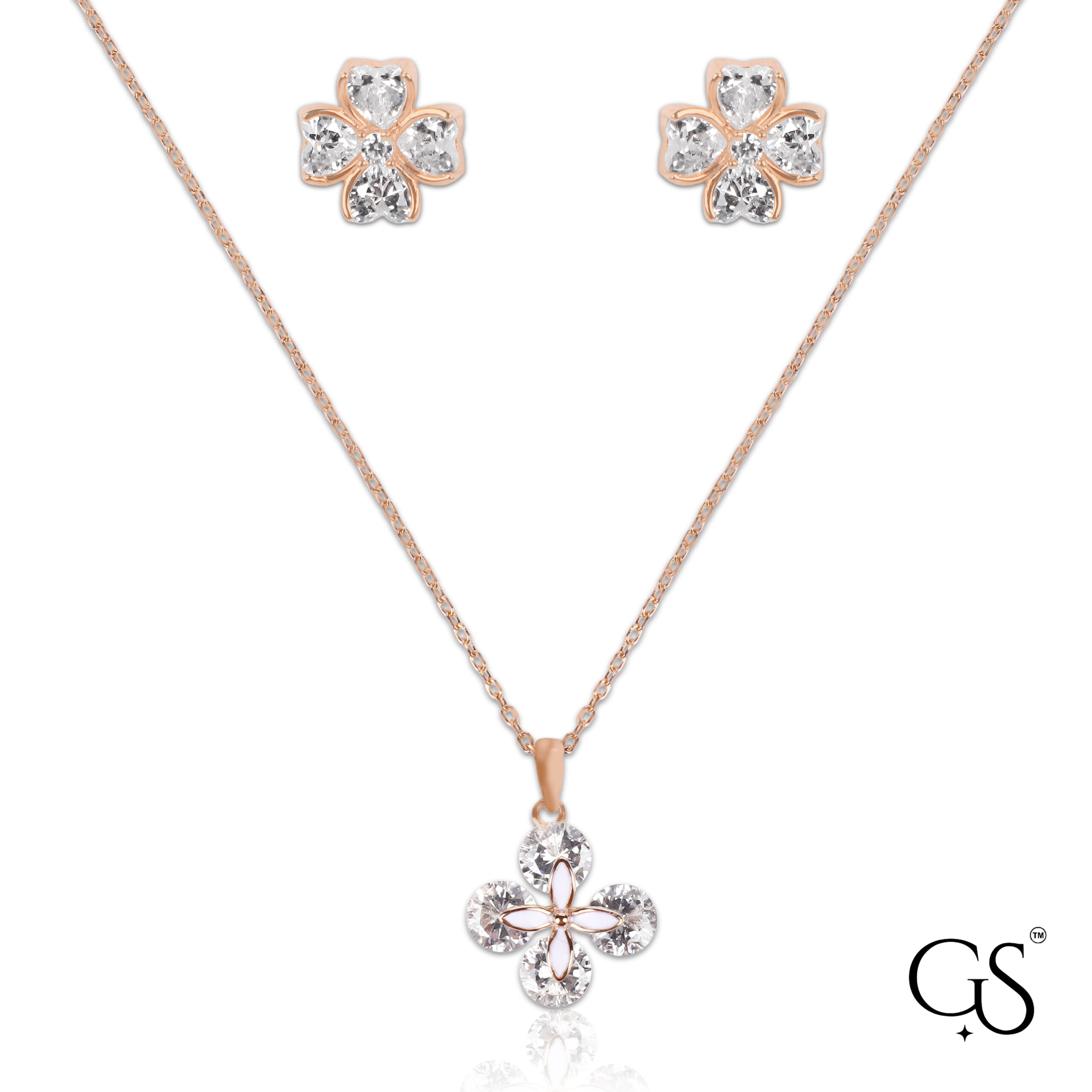 Bring luck and sparkle to your look with this charming matching necklace and stud earring set. Each piece features a delicate four-petal Clover or Flower design, where each petal is formed by a brilliant, heart-shaped clear stone. The entire set is crafted from Sterling Silver and plated in a warm Rose Gold finish. This feminine and dazzling set is perfect for thoughtful gifting, everyday wear, or adding a romantic touch to a special occasion.