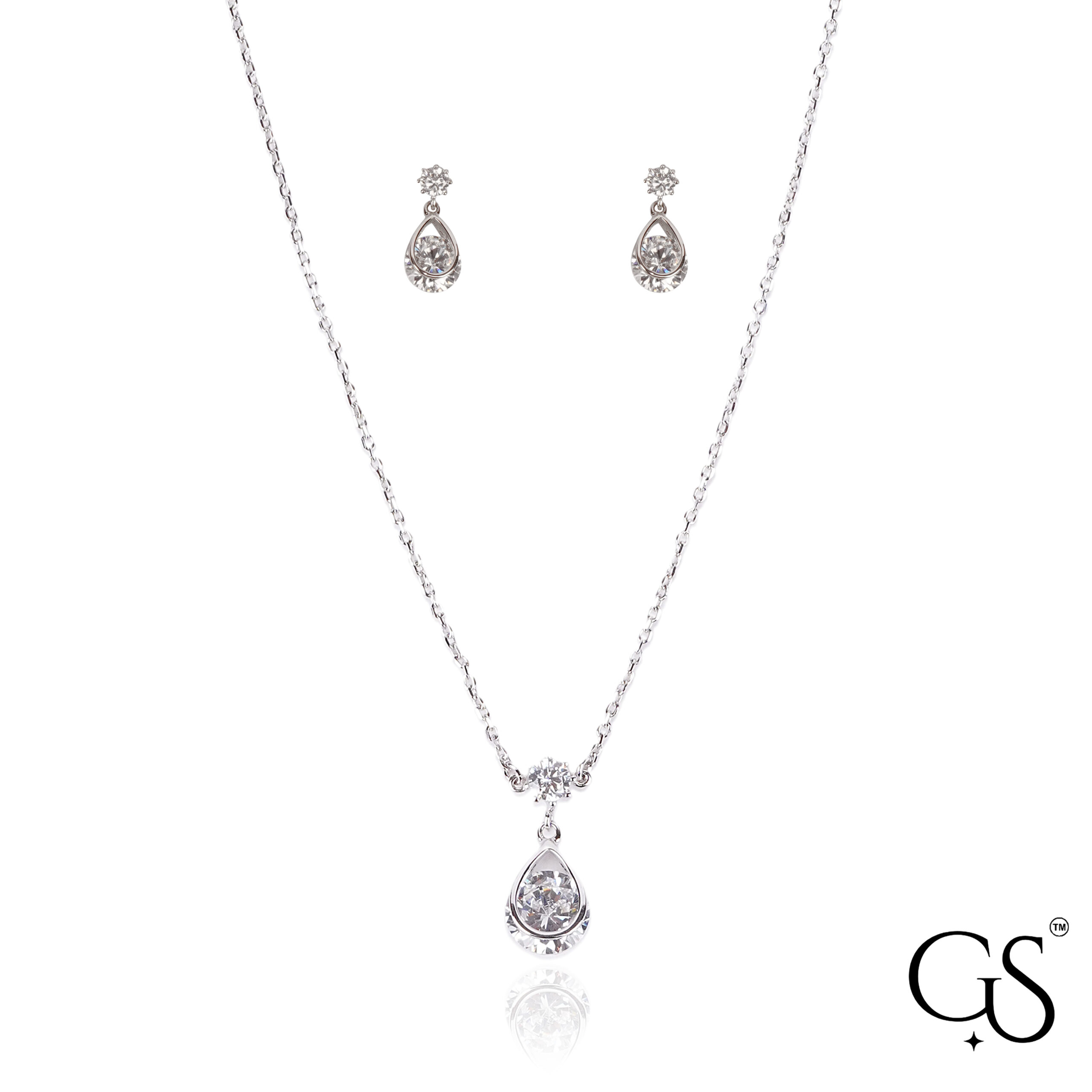 Add a touch of refined elegance with this beautiful matching necklace and earring set. The necklace features a brilliant, faceted teardrop-cut stone suspended beneath a small accent stone. The earrings echo this classic design, featuring a small stud connected to a dazzling teardrop drop. Crafted from Sterling Silver, this set provides effortless glamour, making it a perfect choice for gifting, bridal wear, or adding sparkle to any evening look.