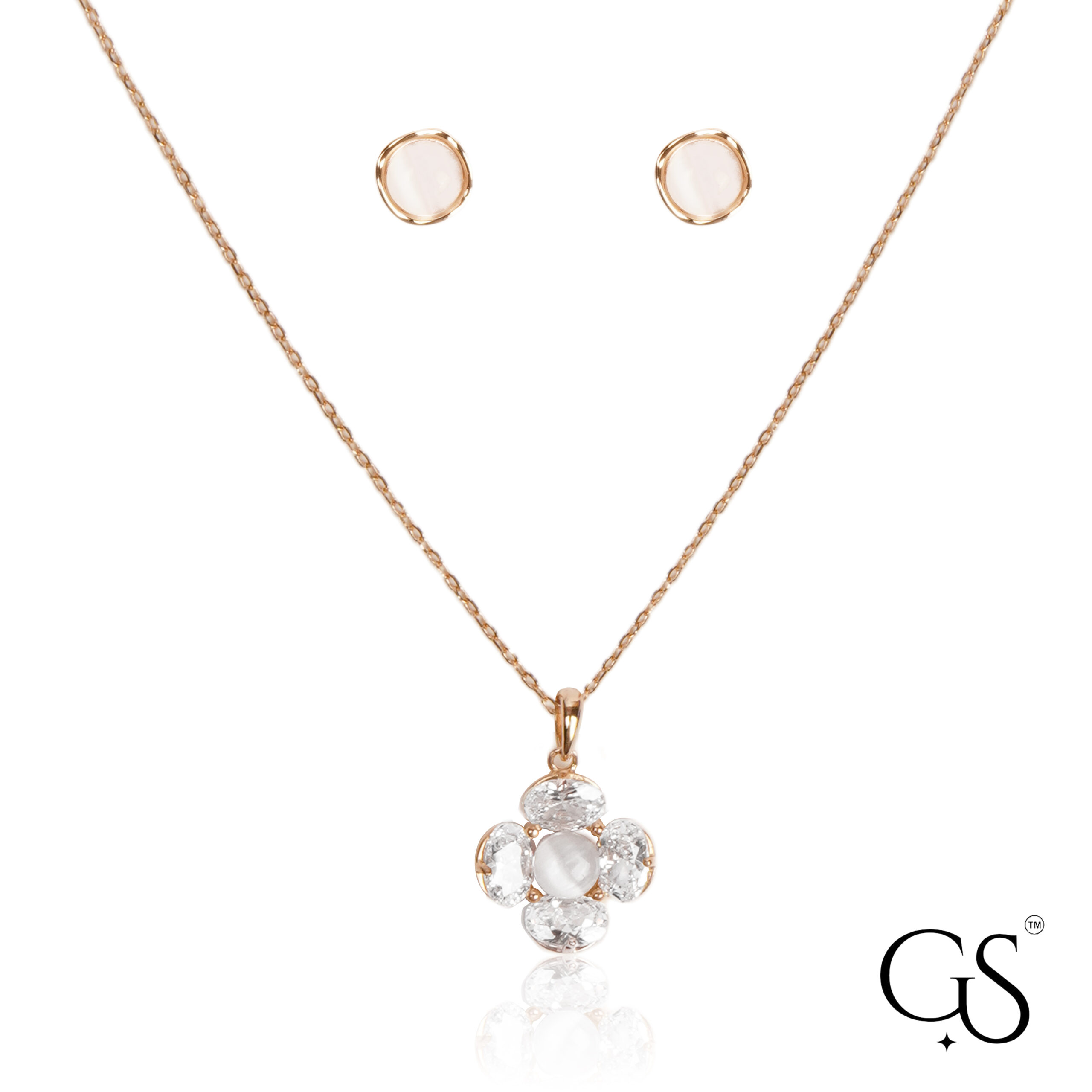 The pendant showcases a lustrous central white inlay (mother of pearl or shell-style) surrounded by four brilliant, clear Cubic Zirconia (CZ) petals. The matching stud earrings mirror the soft, undulating white inlay for a coordinated look. This versatile set is ideal for daily wear or as a sophisticated gift, offering a cohesive, polished style for any occasion.