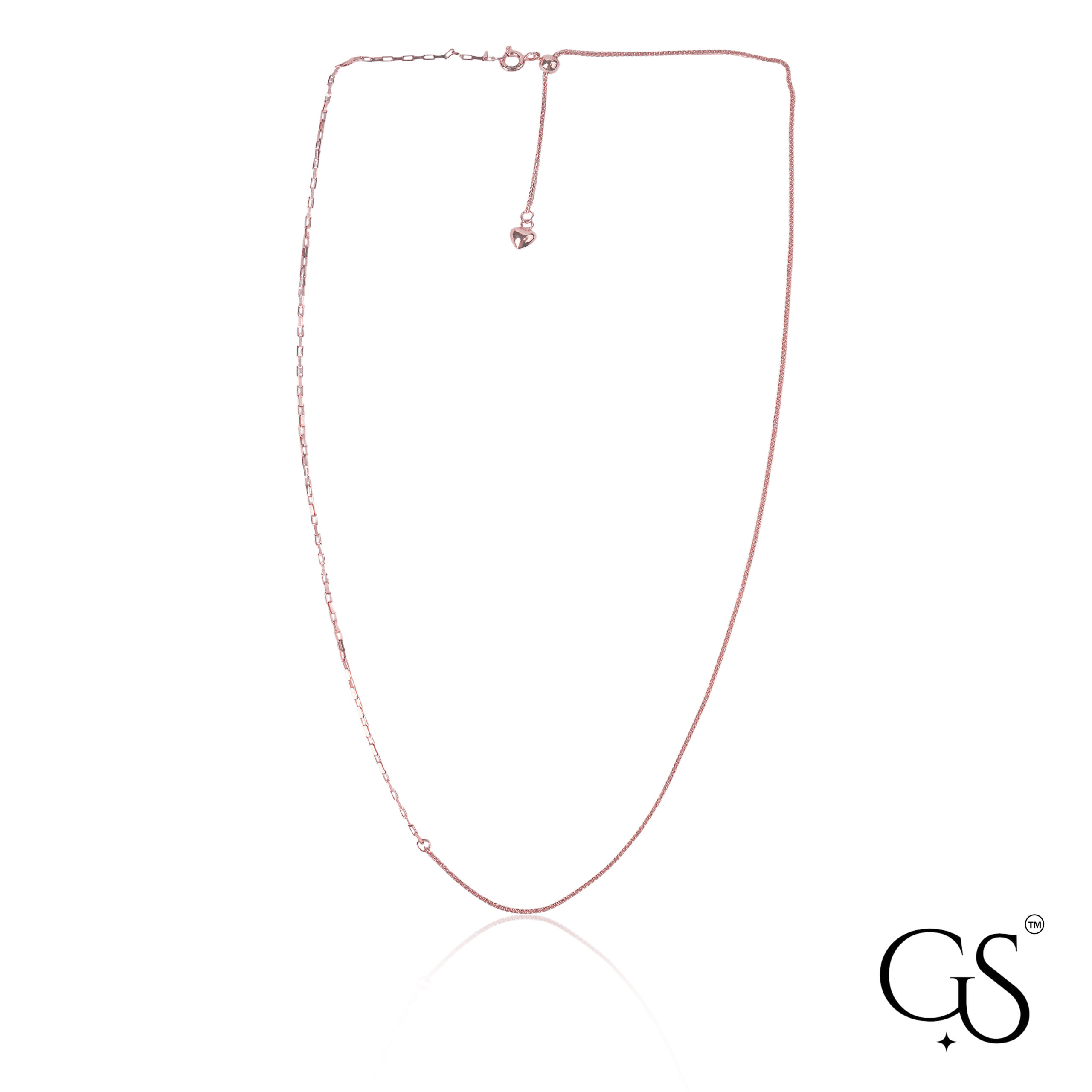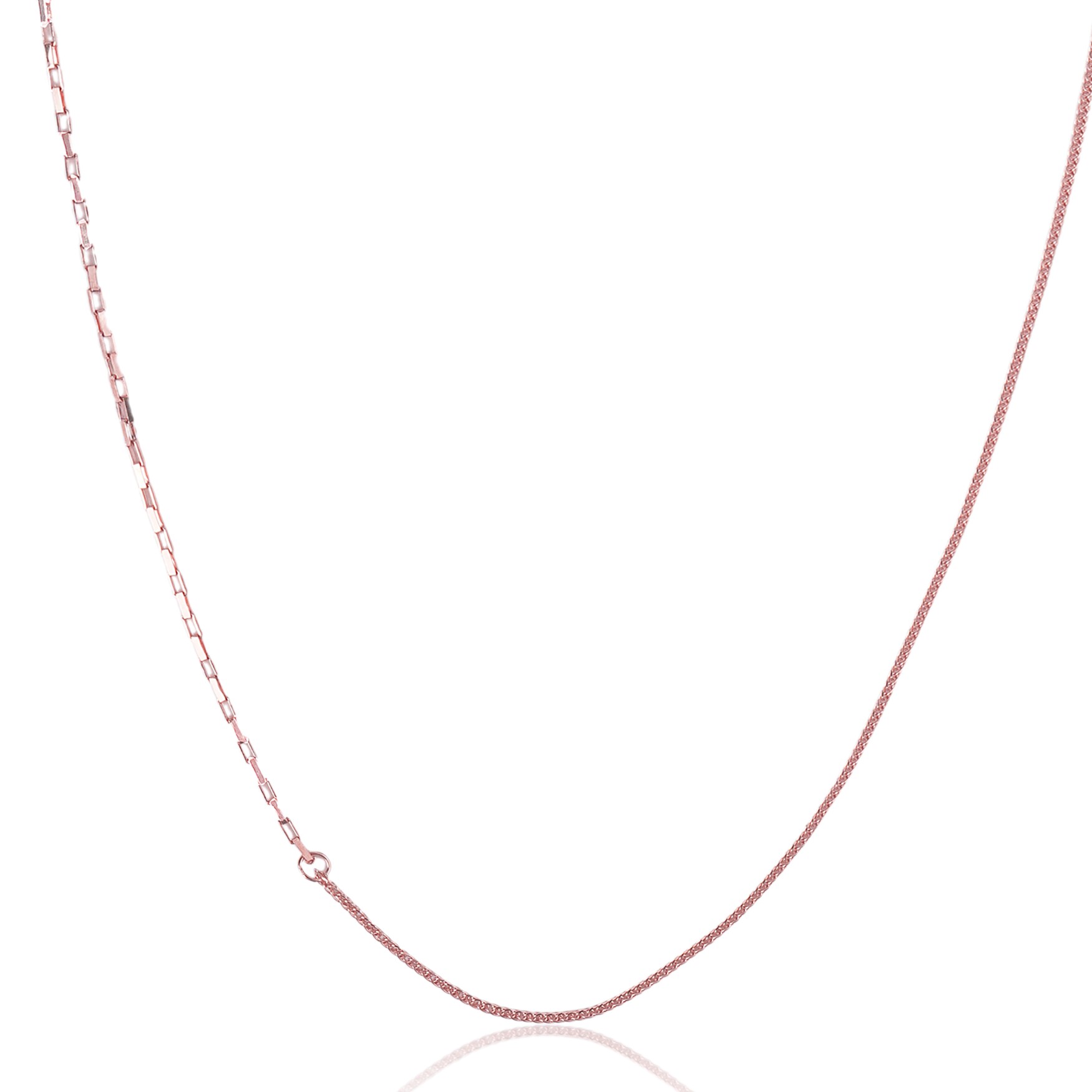 This exquisite 18-inch rose gold chain features a striking asymmetrical design. One half of the chain is a classic, delicate link style, while the other half is a more intricate paperclip or bar link pattern. This unique two-tone chain offers a modern twist on a timeless accessory, making it a perfect statement piece for any occasion.