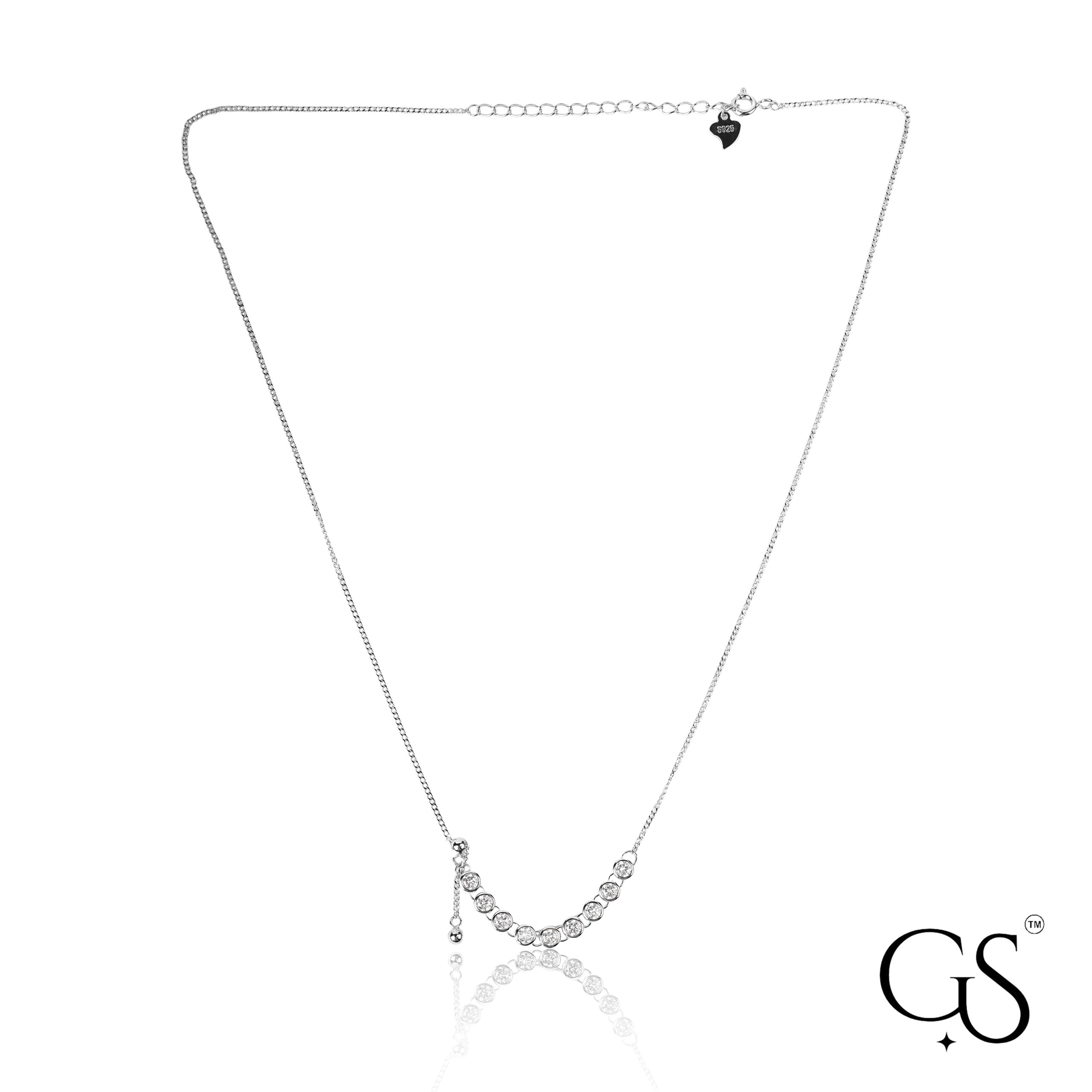 An elegant 18-inch necklace featuring a graceful, curved arc of brilliant cubic zirconia stones. Crafted from genuine 925 sterling silver, this piece adds a touch of sparkle to any outfit, perfect for both special occasions and everyday wear.