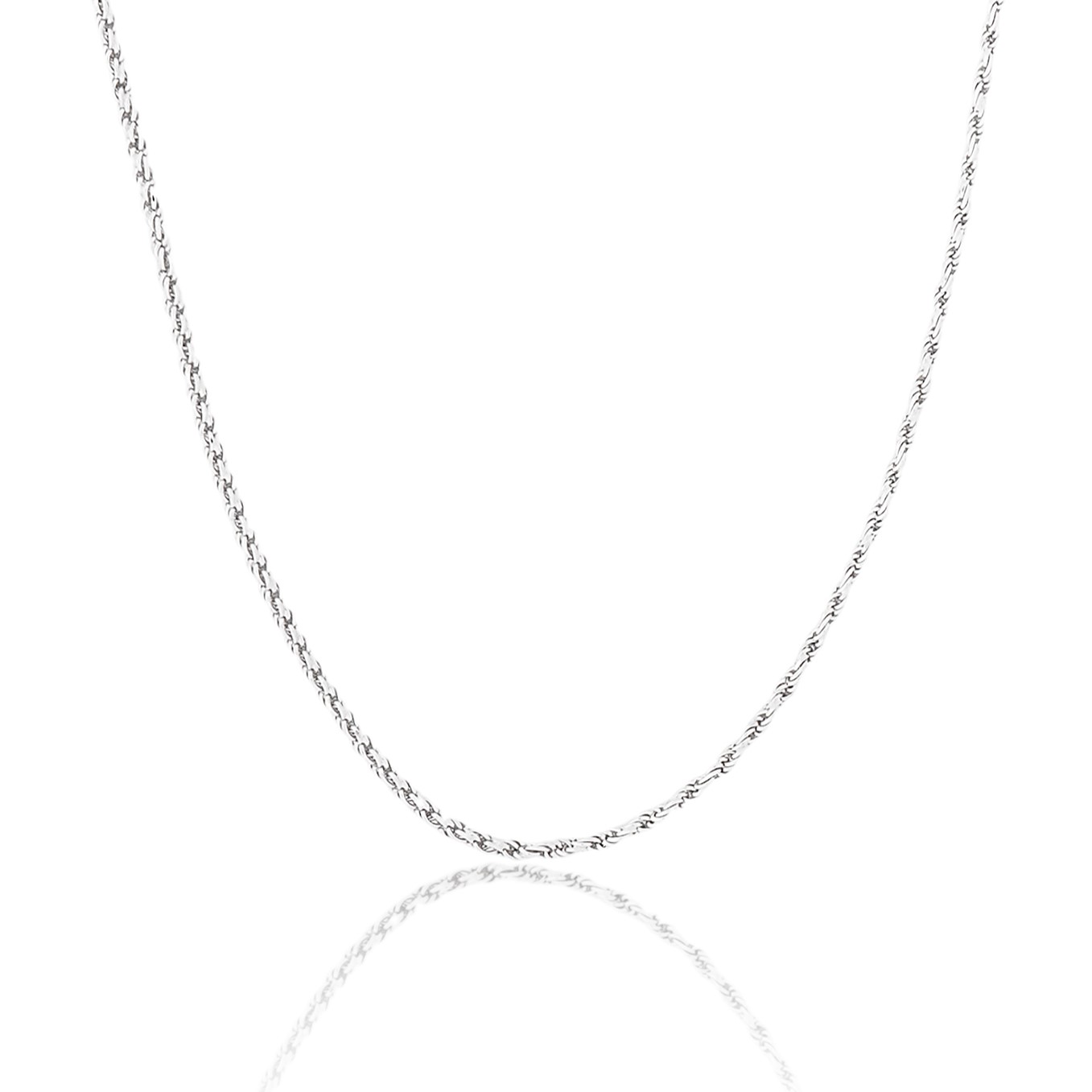This is a classic 18-inch rope chain necklace with a shiny, twisted design that catches the light beautifully. Made of 925 sterling silver, its durable and timeless style makes it suitable for both men and women and can be worn on its own or with a pendant.