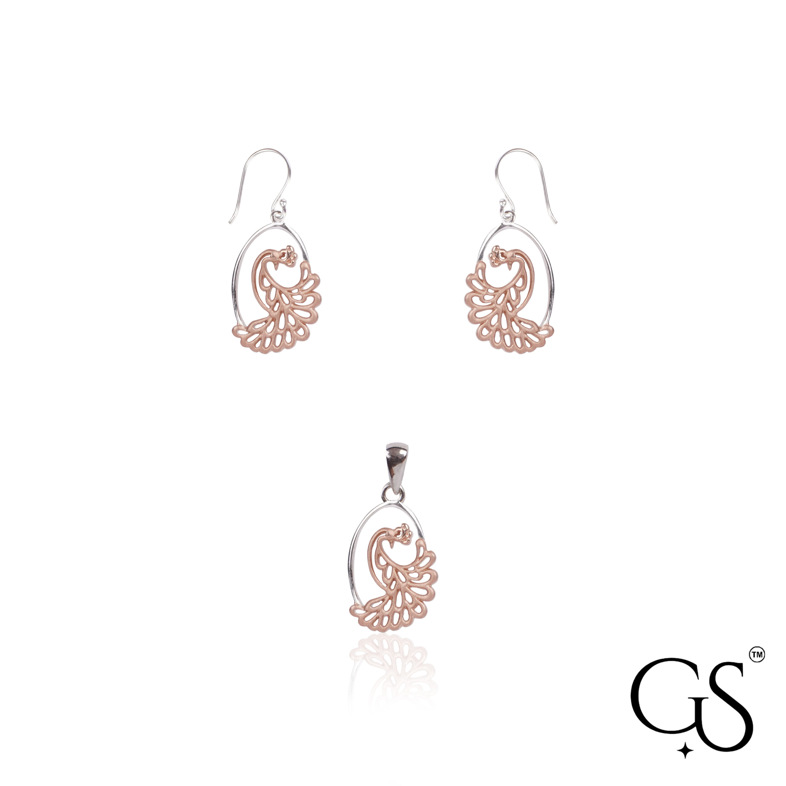 This exclusive and elegant set is crafted from premium 925 sterling silver, featuring a captivating peacock motif. The design gracefully combines a polished sterling silver frame with a delicate rose gold-plated peacock inside, creating a stunning two-tone effect. The intricate details of the peacock’s feathers add a touch of artistic flair and warmth to the overall design.