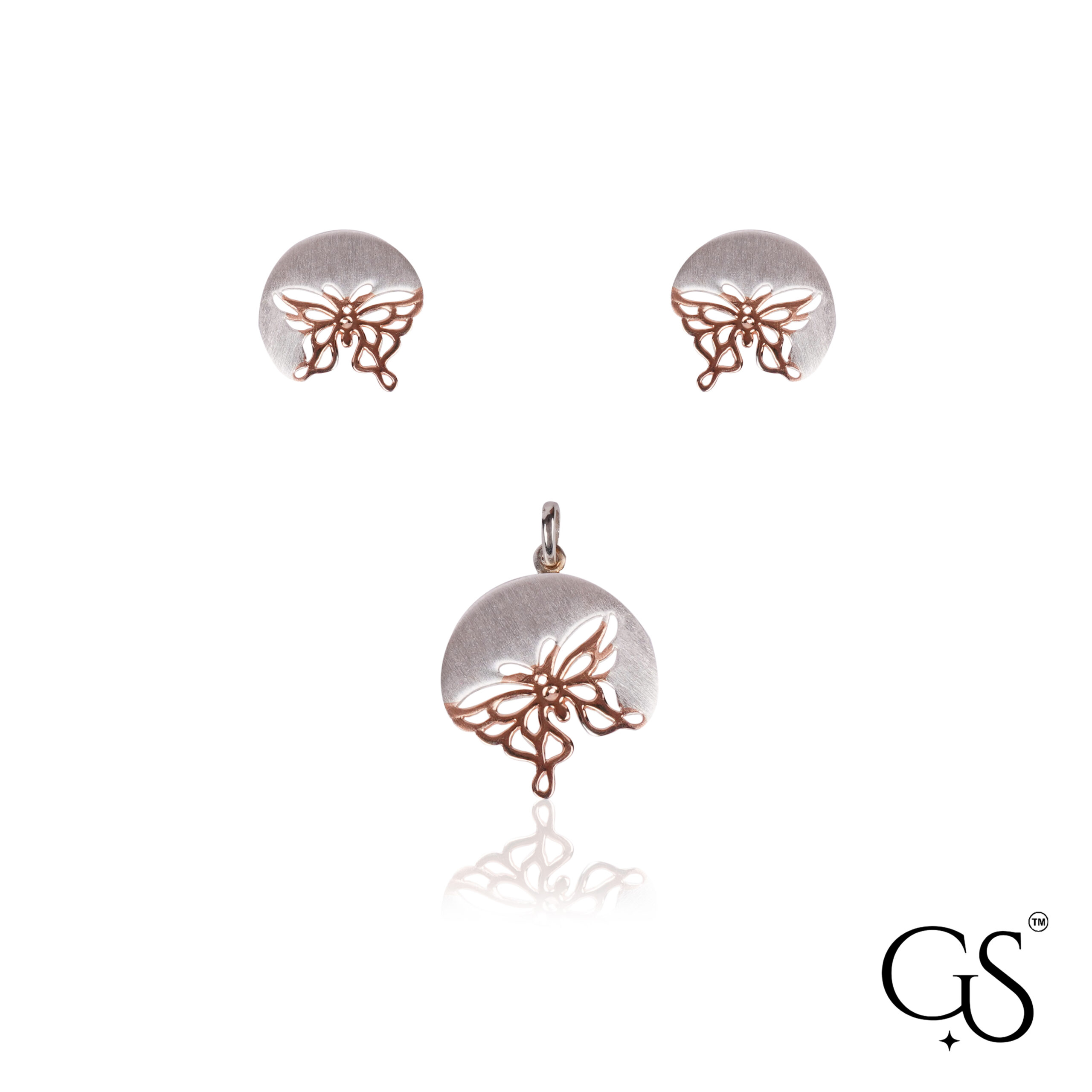 This exquisite and exclusive set is crafted from premium 925 sterling silver, featuring a charming butterfly motif. The design elegantly combines a satin-brushed silver base with a delicate, rose gold-plated butterfly overlay, creating a beautiful two-tone effect that makes the butterfly truly pop.