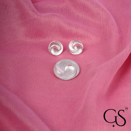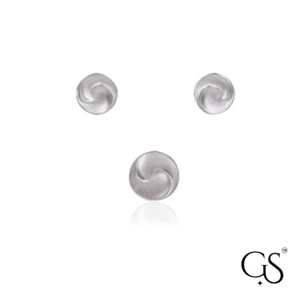 The set includes a commanding pendant and a pair of matching earrings, creating a cohesive and contemporary look. The clean lines and unique pattern make this a perfect statement piece for those who appreciate modern style.