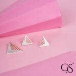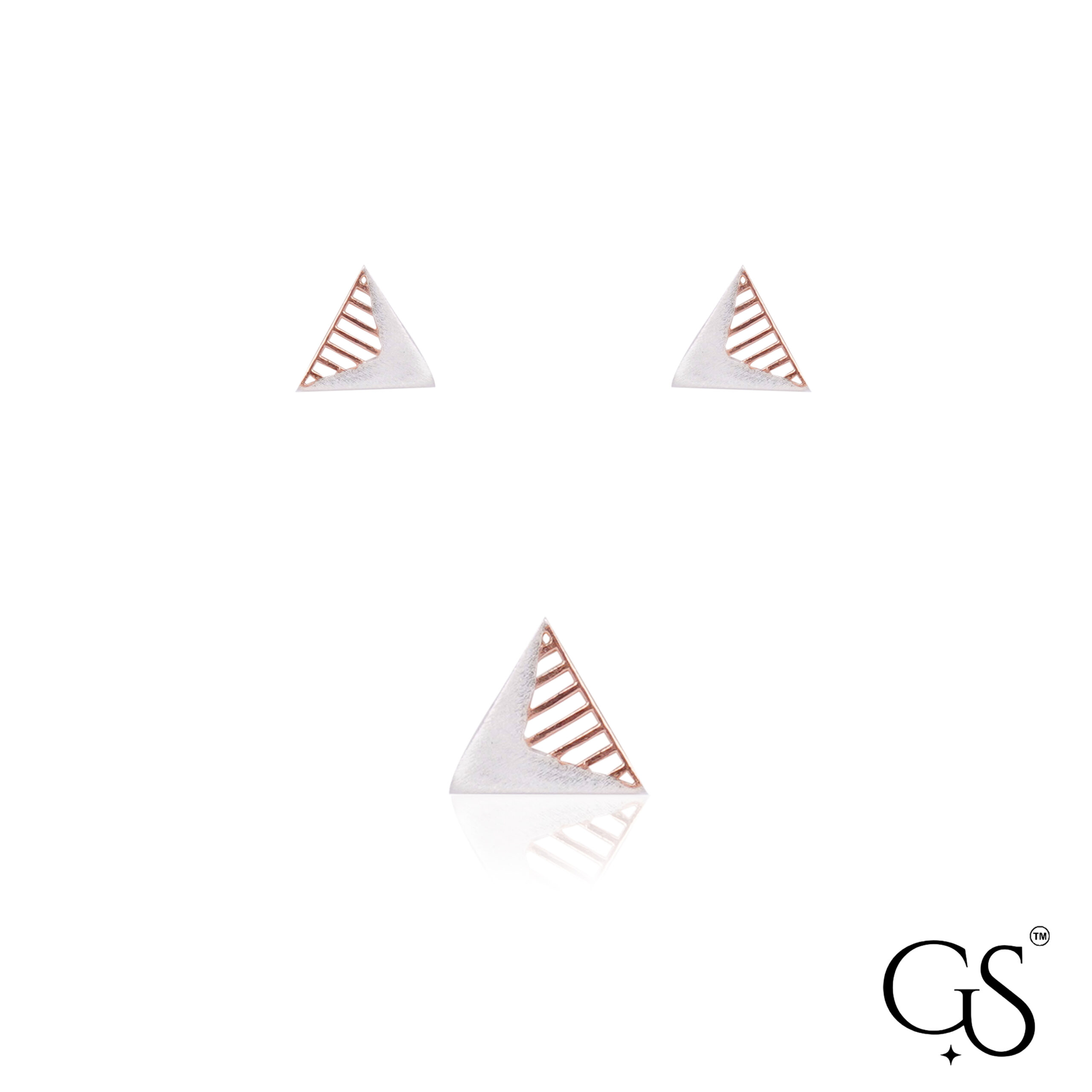 This modern and minimalist set is crafted from high-quality 925 sterling silver, featuring a striking geometric design. Each piece is shaped like a clean, sharp triangle, combining two distinct finishes for a bold, contemporary look. One half of the triangle is a smooth, polished silver, while the other half features a textured, rose gold-plated finish with a striped pattern.