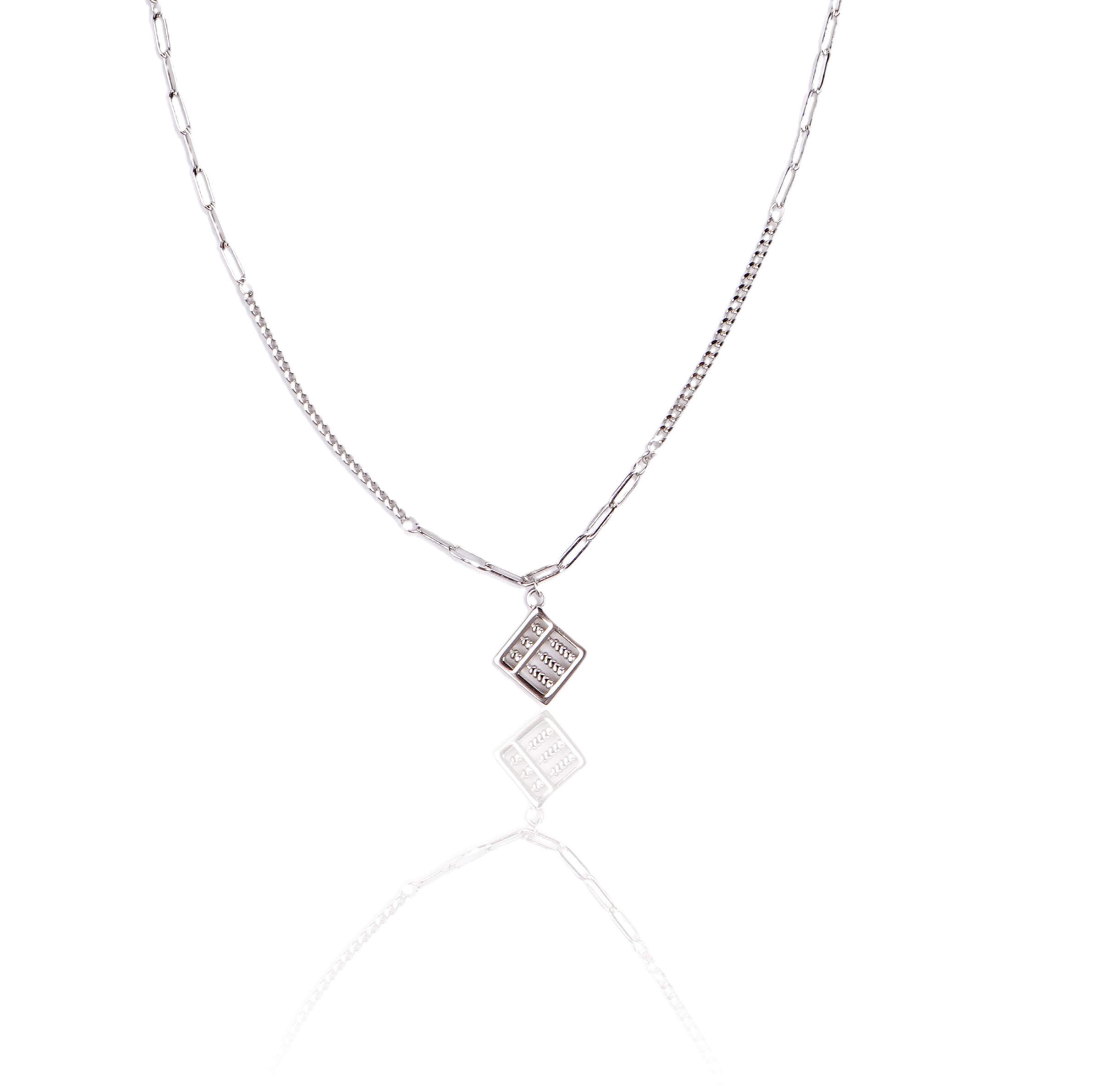 This elegant silver anklet features a mixed-link chain design — combining fine curb-style links with elongated oval links for a modern, asymmetric aesthetic. Attached to the chain is a small rectangular charm, styled to resemble a miniature calendar or grid, adding a unique and contemporary touch.