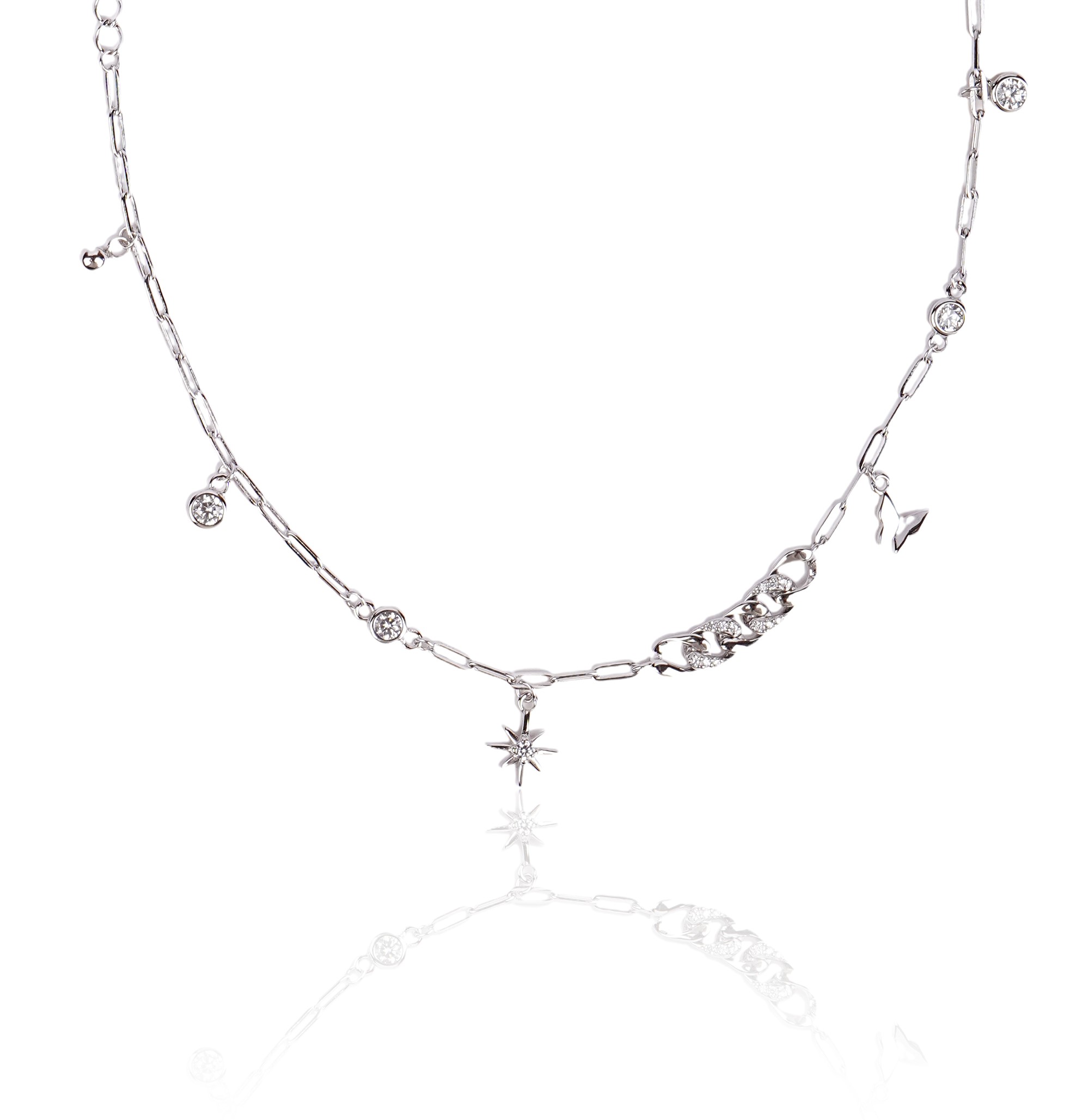 Design: This design features a longer chain with multiple tiny charms, including stars and other circular elements, giving it a celestial and whimsical feel.